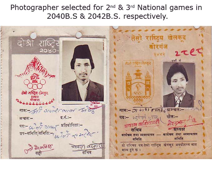 1. In 2040 B.S. & 2042 B.S. (1983-85 A.D.), participated as a photographer in the 2nd as well as 3rd National Games respectively from Gandaki Zone.2. In 2046. B.S. (1989 A.D.), 3rd prize in 2nd National Photo Exhibition organized by Photographers' Association of Nepal.