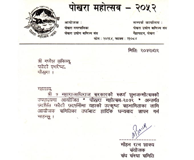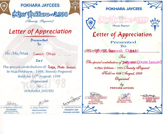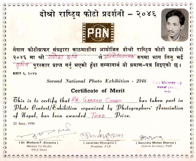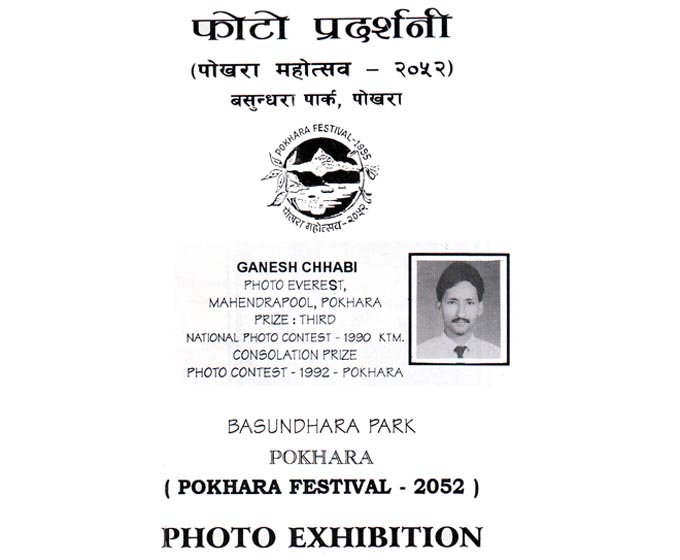 In the 2nd (2040 B.S.) and 3rd (2042 B.S.) national game I was selected photographer from the Gandaki Zone. Likewise I also got to be judge of Miss Pokhara twice. I also took part in National Photographer Exhibition and stood third in the nation. I've also many consolation prizes hosted by several organizations.