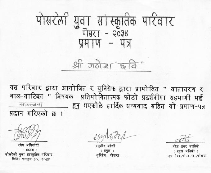 3. In 2046 B.S. (1989 A.D.), consolation prize in "Environment & Child" photography competition organized by "Pokhreli Yuwa Sanskriti Pariwar ".