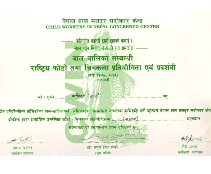 4. In 2049 B.S. (1992 A.D.); Kathmandu, participated in Photo Exhibition & competition organized by Child Workers In Nepal Concerned Center.