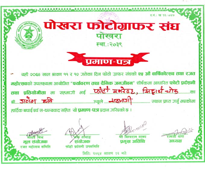 7. In 2064 B.S. (2007 A.D.), participated in Photo Exhibition & Competition on the occasion of Silver Jubilee of PPA (Pokhara Photographer Association).