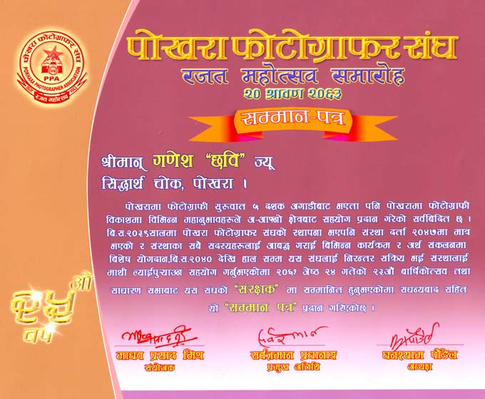 6. In 2061 B.S. (2004 A.D.), elected as Patron (Sansrakshak) of PPA (Pokhara Photo Association).