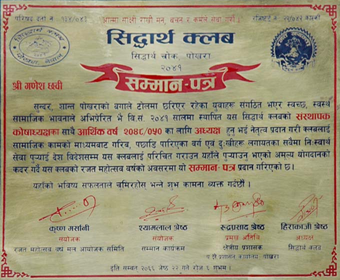 Founder treasurer of Siddhartha Club.